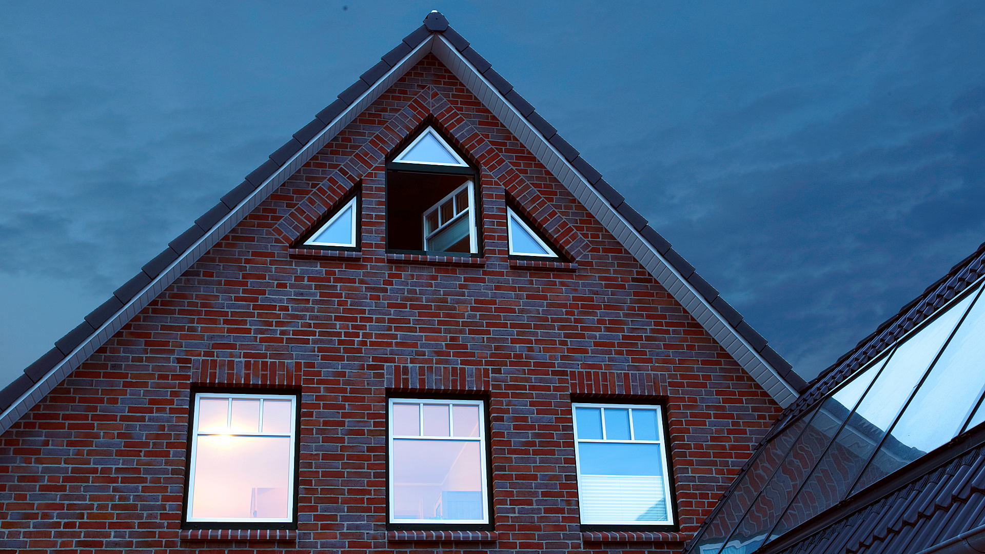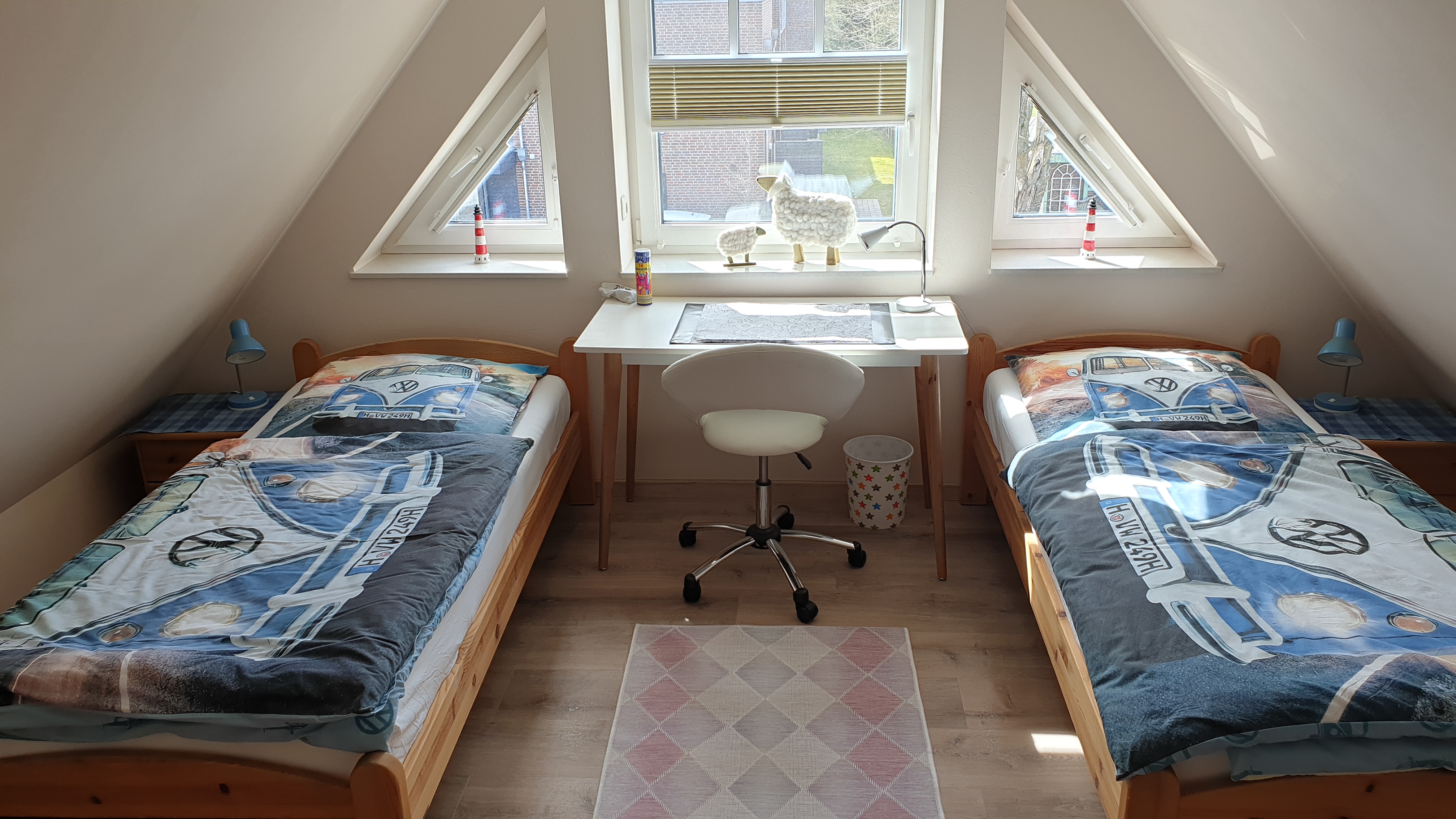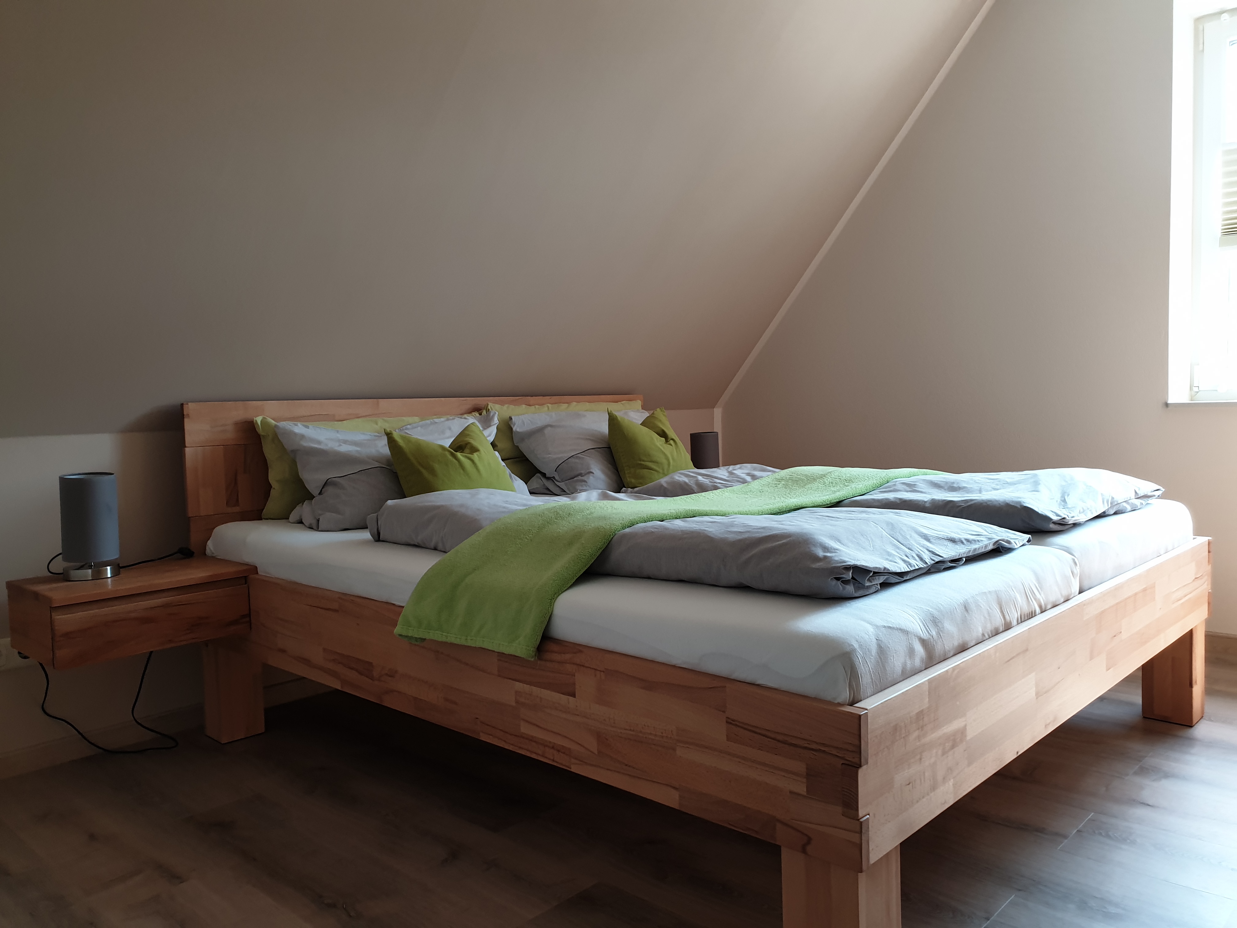 Schlafzimmer mit Doppelbett (1,80 x 2,00 ) erste Etage, zweites Schlafzimmer im Dachgeschoss mit zwei Einzelbetten (0,90 x 2,00) und TV.