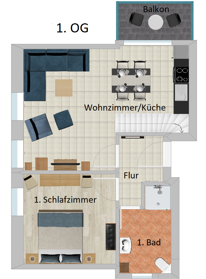 Appartement im Obergeschoss, ca. 72m², gemütlich und hell eingerichtet.